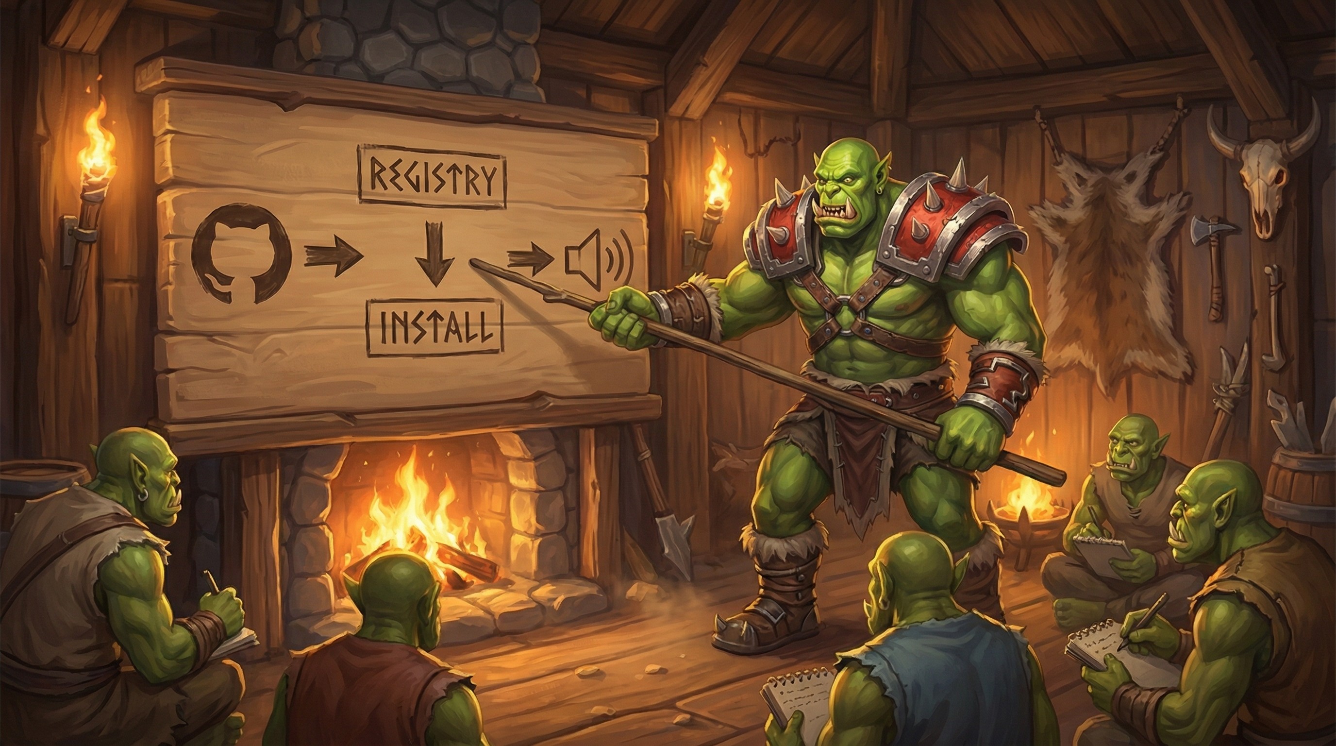 installer reads registry, knows where to download from, fetches manifest and sounds directly from author's repo via raw.githubusercontent.com.